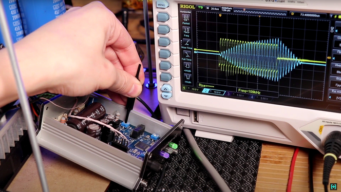 Переходим к настройке корректора фазы. Он нужен для того, чтобы компенсировать задержки и добиться мягкого переключения транзисторов в нуле тока. Иногда, диапазона регулировки резистора может не хватать, как это было у меня, тогда придётся подбирать дроссель. Фазовая автоподстройка частоты работает в широком диапазоне, это видно на примере нагрузки в виде стальной плиты.