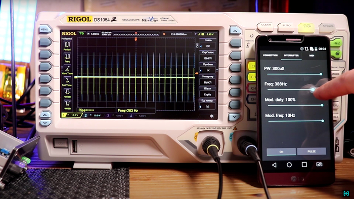 Первоначальная настройка. Тыкаем щуп в отверстие P15 и крутим подстрочный резистор с подписью осциллятор. Нужно выставить резонансную частоту катушки, у нас это 220 кГц. Дальше необходимо отрегулировать форму сигнала пилы, это нужно для правильной работы QCW режима.