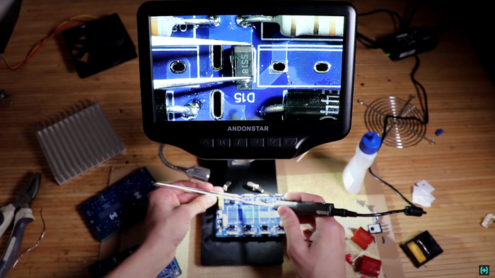 Размещаем электронные компоненты на свои места и достаем паяльник. Плата получилась теплоемкая, потому необходимо хорошо прогревать все контакты. SMD компоненты удобней всего паять под микроскопом.