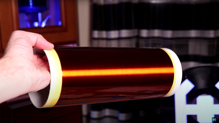 Вторичная катушка высоковольтного трансформатора. Диаметр каркаса тут 10 см, провод 0.2 мм, высота намотки — 24 см, количество витков — 1200. Провод ПЭВТ-2 - для Тесластроения самый топ. Конструкция покрыта двумя слоями полиуретанового яхтного лака для электропрочности и защиты от внешних воздействий.
