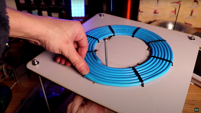 Первичная обмотка выполнена из многожильного медного провода сечением 10 мм. кв, изоляция ПВХ. Длина 4 метра, маркировка ПВ3нгд 10. Катушка будет спиральная, потому скручиваем ее в улитку на куске фанеры и надежно фиксируем стяжками. Должно получится полных 7 витков.