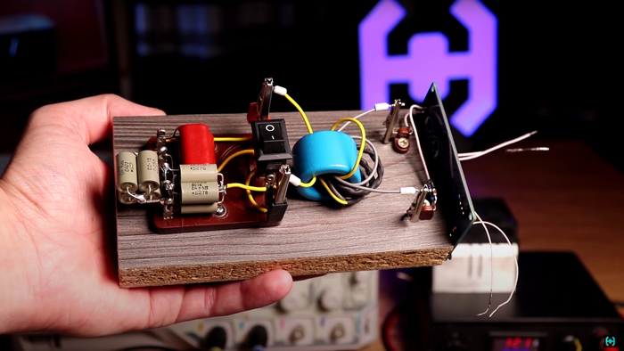 Для подбора необходимой ёмкости был сделан "Магазин ёмкостей". Состоит он из переменного конденсатора с регулировкой от 50 пФ до 1.2 нФ и клеммной колодкой куда будут устанавливаться пленочные высоковольтные красные ребята. Марка конденсаторов CBB-81. Вставляем некоторое количество в посадочные места. Сигнал будем снимать либо с ножек конденсаторов, либо с токового трансформатора через который пропущен один виток первичной обмотки.