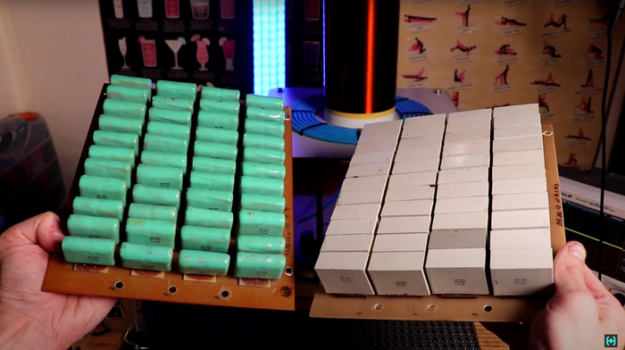 Как подсчитать необходимую ёмкость. Допустим мы знаем что нам нужно получить 44 nF напряжением 10 кВ. Для этого последовательно соединяем 10 конденсаторов емкостью 150 nF и напряжением 1 кВ. 150 делим на количество конденсаторов в паровозе и получаем емкость 15 нФ. Чтобы получить 44 nF нужно добавить параллельно еще две такие ячейки. Точные расчетные цифры не всегда выходит получить, потому сборки в 45 nF более чем достаточно.