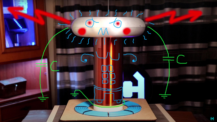 Для справки. Съемка этого выпуска заняла три месяца. Стоимость конструкции обошлась примерно в 400 баксов. На вопрос какое практическое применение имеет катушка тесла, отвечаю: "Камонн - Джим Кери".