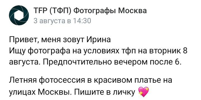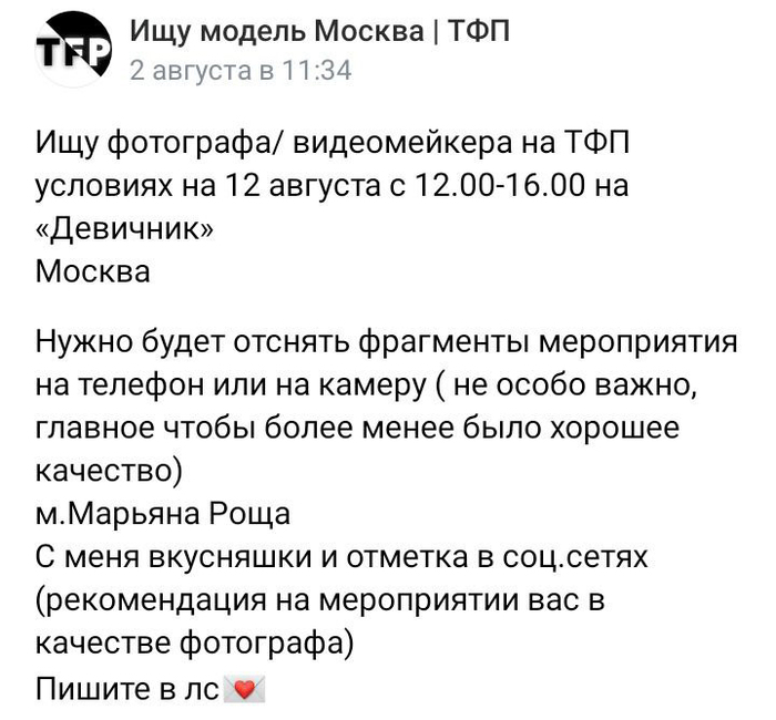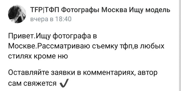 По этим объявлениям сразу видно, что фотографам плевать на самоуважение и они готовы снимать любых халявщиков. Опыт не нужен, съемка бесплатная, любые жанры и идеи – это все признаки отсутствия критического мышления, деградации и разрушение понятия TFP.