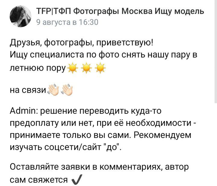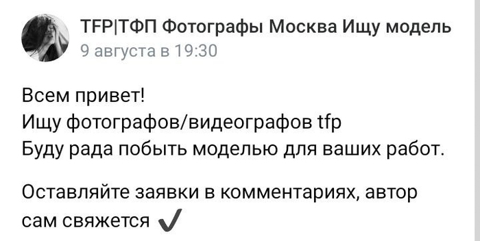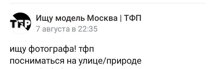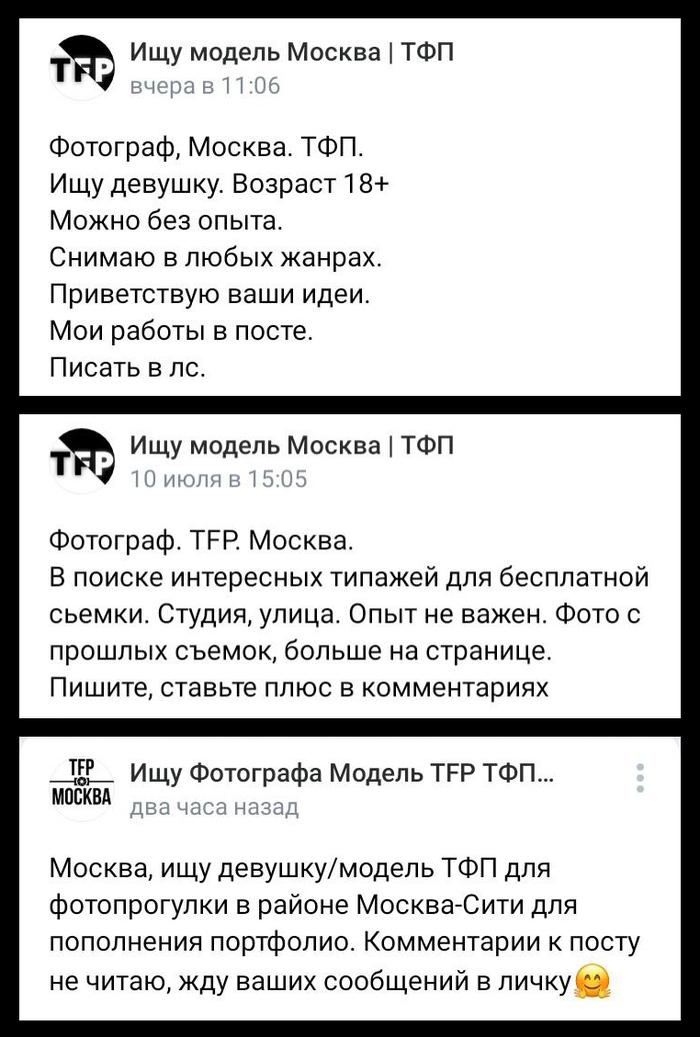 В этих трех статьях я затронул важную тему о неверном толковании понятия TFP. Для чего? Да просто больно смотреть, как деградирует мое ремесло, как жадность подчиняет здравый смысл, как люди вырабатывают иммунитет к самоанализу и критическому мышлению. Это попытка открыть людям глаза, попытка заставить обращать внимание на последствия, совершенные по непониманию, отсутствию опыта и прочим причинам. В 2023 году VK - основная социальная сеть для поиска новых клиентов, так почему бы не навести тут порядок? Хотя бы попробовать. Посмотрите на эти сообщества TFP, где админы плевали на соблюдение всех норм адекватного сотрудничества между моделями и фотографами. Такое наплевательское отношение помогло создать благоприятную атмосферу для роста халявщиков.