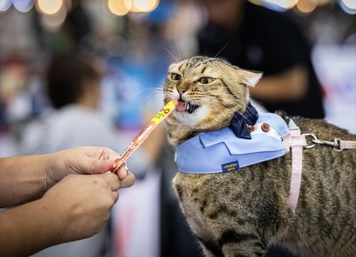 В Таиланде прошел конкурс по поеданию корма на время среди домашних животных. Победителем стал кот по кличке Киммон — он съел ложку лососевого лакомства за 49,42