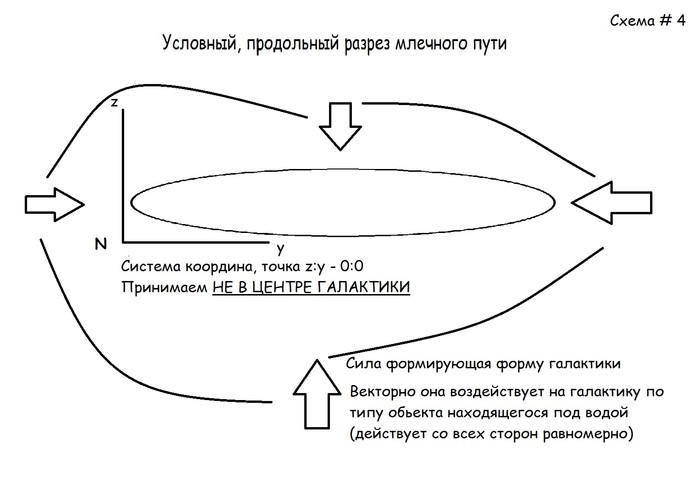 Данная условная точка N – начало координат, нужна для определения общей массы галактики и, как следствие, определение её на некотором уровне в пространстве: чем масса выше, тем ниже уровень галактики, и наоборот (требуется произвести расчёты положения соседних галактик, их масс, и сделать сравнения). Данная система координат позволяет упорядочить принятый хаос в космосе (условно). Метод пробного камня. Из размышлений выше, нас интересует край галактики, за которой стоит некоторая сила, которая держит галактику в равновесии. Черная дыра в центре (объект огромной массы) – не единственная сила способная на таком расстоянии удерживать огромное количество звёзд в одной системе. Она мала и не должна являться основной силой.