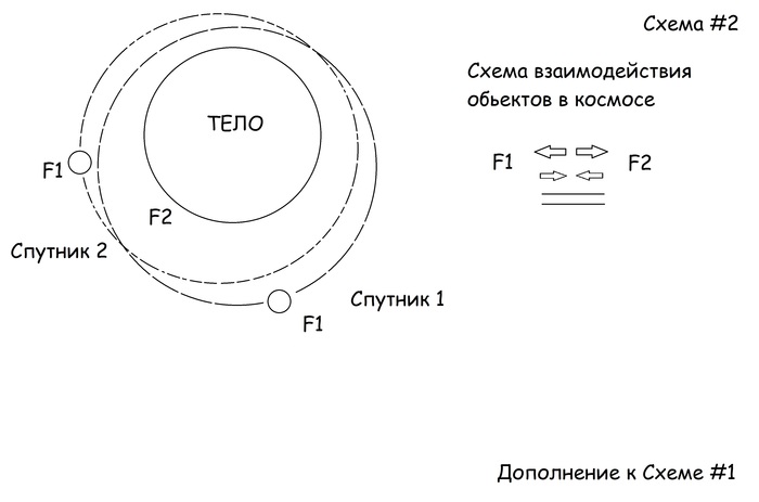 Рассмотрим наглядную схему, которую я опишу следующим образом: представим космическую систему с n количеством объектов (для упрощения будем рассматривать массивный объект и его спутники по схеме #1, траектория спутников может иметь разные формы). Сразу хочу сказать, что тут можно подразумевать как солнечные системы, так и галактики в целом. В данном варианте, для упрощения была взята система: планета - спутники. Имеется множество гарантированных объяснений, почему в данной схеме все выглядит именно так, а не иначе: силы притяжения отталкивания, орбитальное движение по некой окружности или эклиптики, гравитация и т.д.