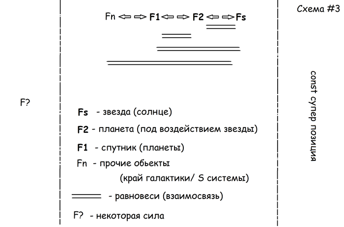 На схеме #3 F? - та самая сила, о которой идет речь. Сonst суперпозиция, в нашем случае это звезда (солнце) имеющее самую крупную силу под воздействием, которой формируется солнечная система (влияние черной дыры в центре галактики рассматриваем параллельно)