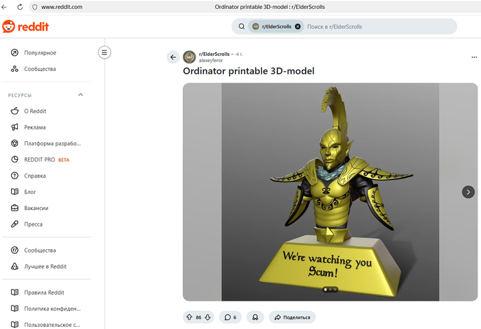 Я занимаюсь разработкой и созданием фигурок по мотивам видеоигр под псевдонимом Механический мимик - это моё хобби, переросшее в работу. Недавно закончил фигурку Ординатора из серии TES, куда встроил интересную фичу - датчик движения, который очень подходит данному персонажу.