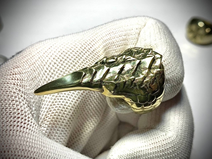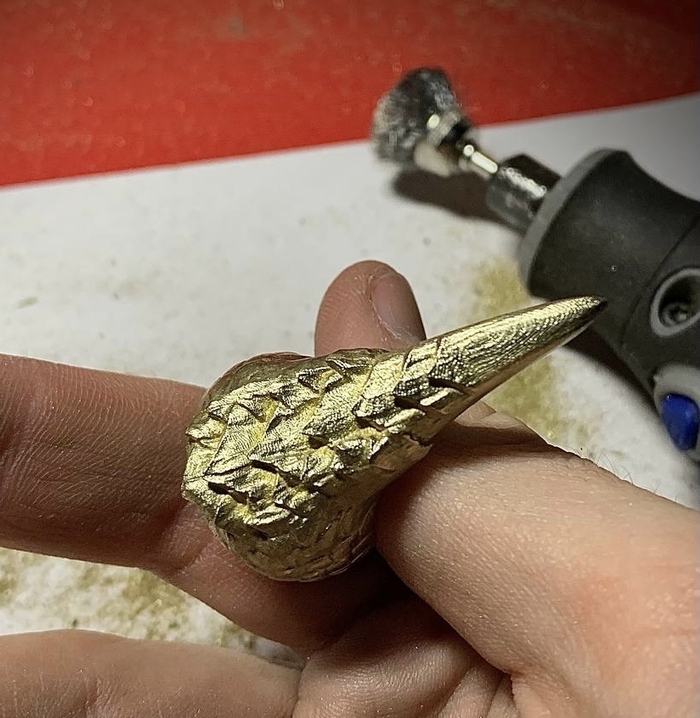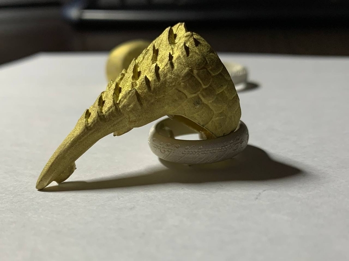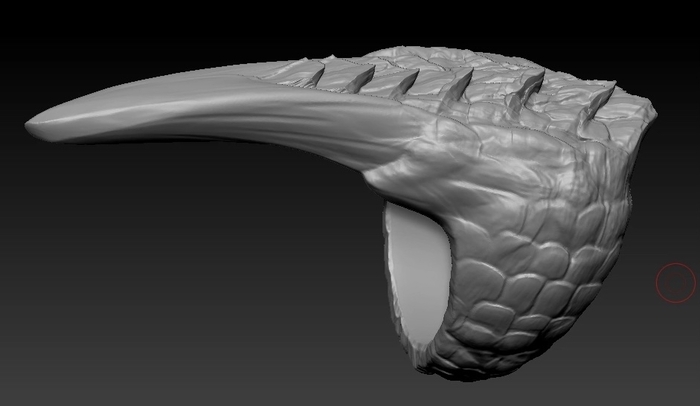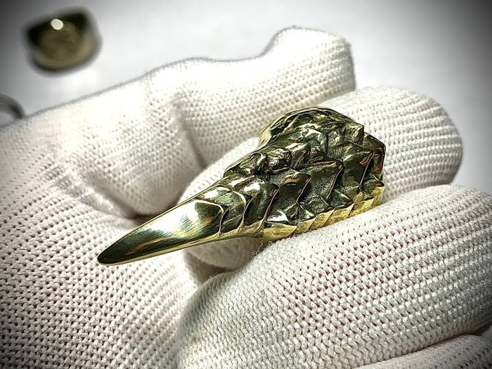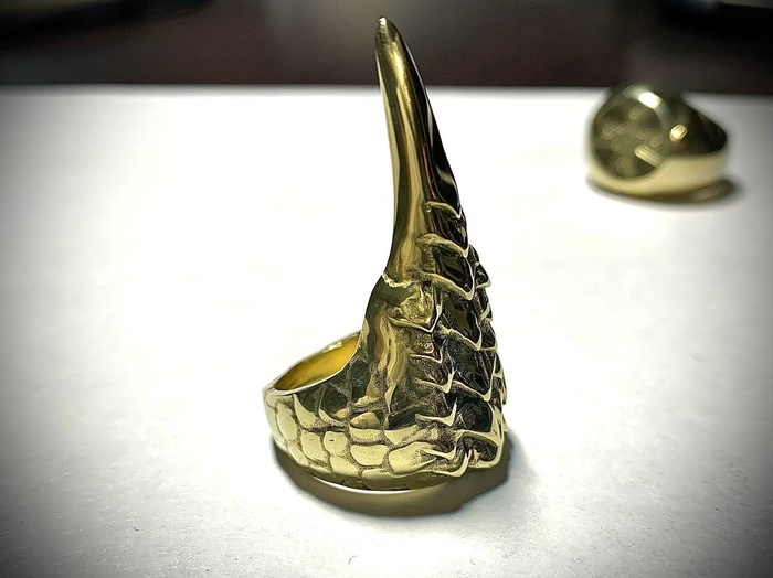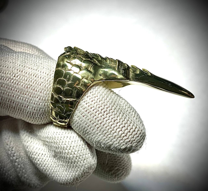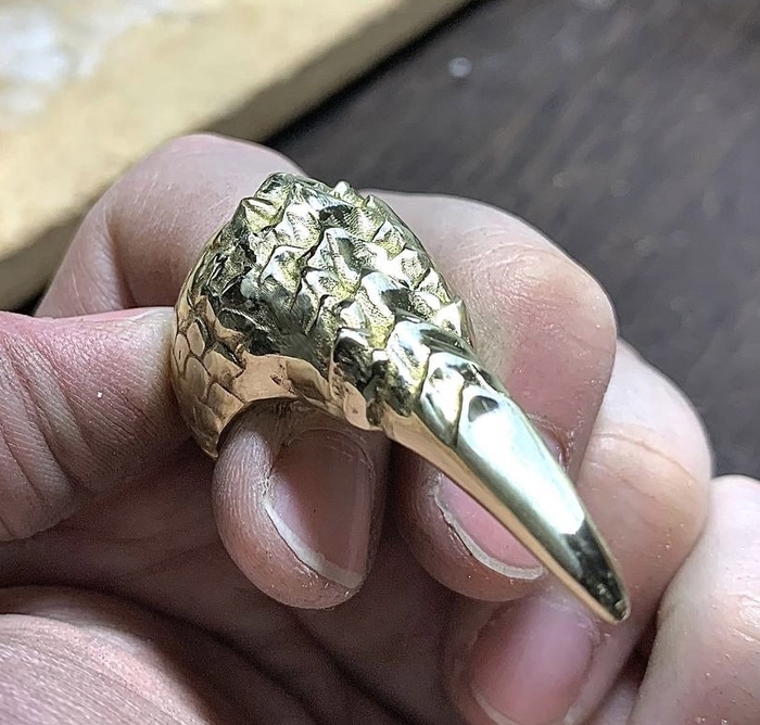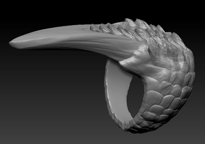 На этот раз от фаната игры The Elder Scrolls V: Skyrim. Был заказан перстень с чешуей и когтем, металл обязательно желтого цвета. Я такого перстня в игре не припомню, но заказчик захотел - я сделал. Было разработано несколько вариантов моделей на выбор: с большим количеством чешуи, с разной длиной самого когтя, разные вариации обоих параметров.