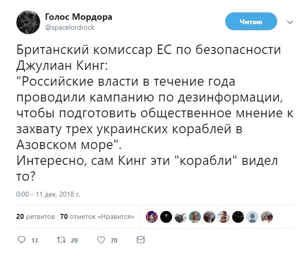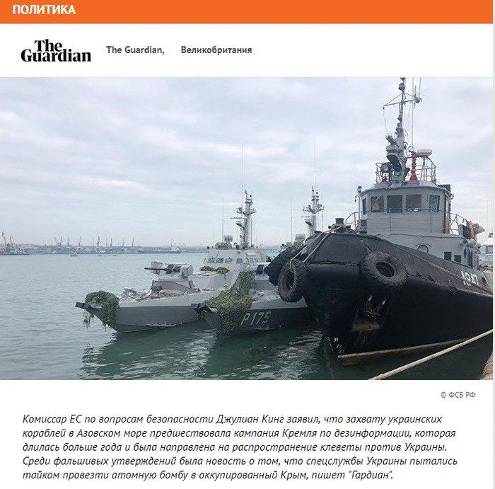 «Вы ошибаетесь, если думаете, что этот инцидент возник на пустом месте, — сказал Кинг, выступая в Брюсселе. — Кампания дезинформации началась намного раньше, более года тому назад, когда российские СМИ приступили к распространению сообщений о том, что киевские власти углубляют дно Азовского моря, готовя места для размещения натовских кораблей.