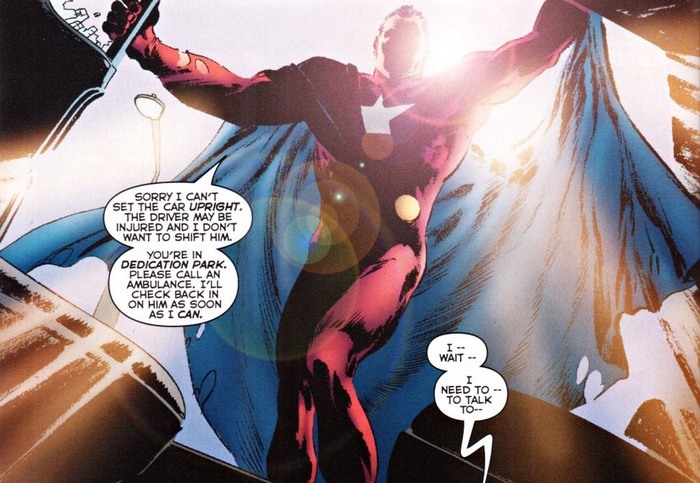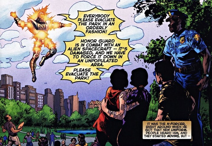 Их дело, а пока есть смысл перейти к комиксу Astro City: Local Heroes #4. Чел по имени Винс рассуждает о том, как нелепы ритуалы и суеверия и о том, что иногда есть основания для их существования, и вспоминает историю, которая произошла в Астро Сити в 1974 году. Тогда вообще много странностей произошло – был казнён Серебряный Агент, а Старый Солдат, всегда бывший на стороне США, оказал сопротивление американским войскам во Вьетнаме. Винс был тогда адвокатом в уголовных делах, а адвокаты обожают ритуалы. Клиентом Винса был Ричи Форджоне, сын преступного авторитета, за предполагаемую измену при свидетелях насмерть забивший девушку бутылкой. И Винсу очень уж хотелось проучить наглого богатенького обвинителя. Но дело было не выиграть. Свидетелей было много, других доказательств тоже. Размышляя над делом, Винс пошёл отдохнуть в парк, но объявился Н-Форсер (участник Почётной Стражи, “Железный Человек”) и приказал всем покинуть парк, ибо на парк мог рухнуть подбитый инопланетный звездолёт. И тогда Винс отметил, что многие люди были недовольны. Они видели, что на парк падал звездолёт, но всё ворчали, что им мешают отдыхать.