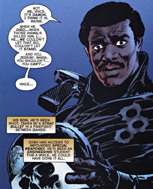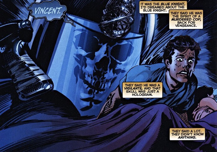 Когда наступил день суда, Винсу было нечего крыть против более 20 прямых очевидцев и инфы криминалиста о крови и кусочках мозга пострадавшей на бутылке, столе и стене. А Винсу начал угрожать старший Форджоне, отец “нашкодившего”. “Что ты за адвокат такой, что моего дурака сына отмазать не можешь?!”. Винсу тогда хватило слабоумия и отваги огрызнуться в духе “Я работаю, не лезьте под руки”. Прикрикнуть на человека, о котором известно, что огорчившие его люди и члены их семей пропадают без вести. А у Винса сын был в детском садике...впрочем, просмотр новостей, и в частности, сюжета о столкновении Уличного Ангела с Лихомозгом, натолкнул Винса на идею...и ночью ему приснился стрёмный сон о Синем Рыцаре, таинственном то ли призраке, то ли линчевателе призрачного образа. Подняв архивы, Винс пошёл в суд и применил рискованные аргументы.
