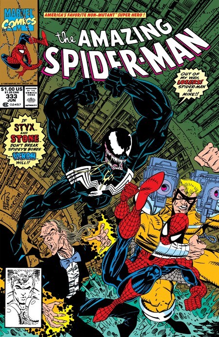 А доберутся они в комиксе, который завершит сегодняшнюю часть подборки, а именно – Amazing Spider-Man #333 за июнь 1990 года, от Дэвида Майкелини и Эрика Ларсена. Питер Паркер проводит время в гостях у тёти Мэй. Стоит тёте отойти на кухню, к Питеру подкрадывается Веном и вручает карту, на которой отмечено его логово. «Приходи в течение 24 часов, а то пожалеешь». Поняв, что это угроза в отношении тёти, Питер полыхает, но Эдди Брок клянётся и божится, что таких божих одуванчиков, как Мэй, он в жизни не встречал, и вредить ей не собирается. А Стикс и Стоун отчитываются перед Цезарем: Человека-Паука видели, но в драку решили не вмешиваться, чтобы не попасть под раздачу. Но в следующий раз точно устроят Стенолазу разнос. Заодно Стикс рассказывает, откуда у него смертоносное прикосновение. Это оказывается побочное воздействие вакцины от коронавируса экспериментального лекарства от рака. Он теперь почти вампир, высасывает жизнь из растений и живых существ одним прикосновением.