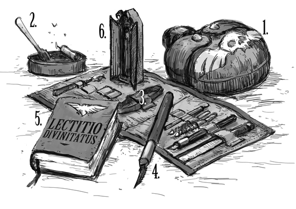 5) Одна из важных частей вашей аптечки - литература, одобренная Экклезиархией. Из-за того, что новые издания при перевозке были потеряны в варпе, ваша аптечка содержит старую версию обрядов Имперской религии, написанную <<ВСЕ ДАННЫЕ УДАЛЕНЫ>>.