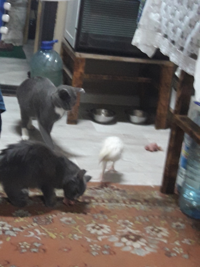 Крысы сожрали маленьких бройлеров, остался один. Взяли домой, пока травим крыс. Назвали ДиКаприо, сначала. А сегодня он начал "отжимать" у котов куринные головы... Лектор будет похоже. Снимал на куринную ножку.