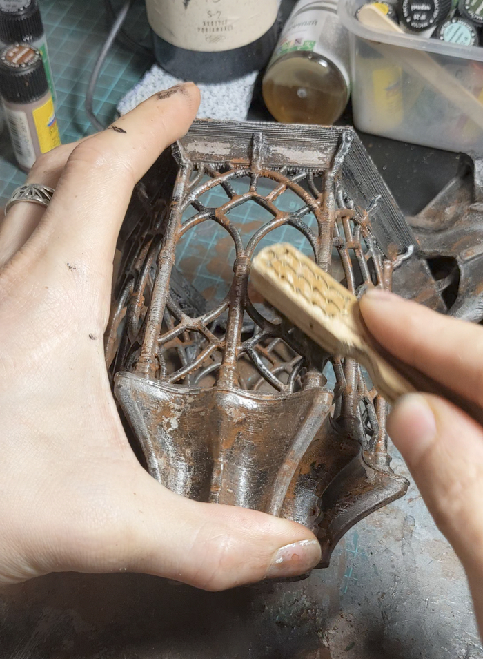 5 - Далее необходимо было создать эффект ржавчины и подтёков, у нас же старый, готический фонарь. Для этого развели максимально жидко краску "ржавчина" и проливая ее и промакивая ватной палочкой нанесли не те места, где по нашему мнению она могла образоваться и раздули ее аэрографом. Где-то просто воздухом, где-то с водой.