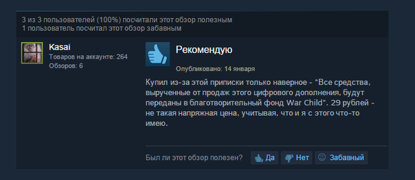 Это не «приятная» игра на всем своем протяжении. Я переживал: добудет ли мой персонаж немного собачьего корма. Я избивал бродяг, просто чтобы добыть немного лекарств и пережить ночь. Я не предпринимал ничего, пока группа солдат нападала на невинную женщину. Как я говорил, эта игра мрачная и бесчеловечная. Если вам это не нравится – эта игра не для вас. Но для меня это приятная замена множеству других игр. Иногда вам хочется посмотреть «Список Шиндлера», а иногда сыграть в «This War of Mine».