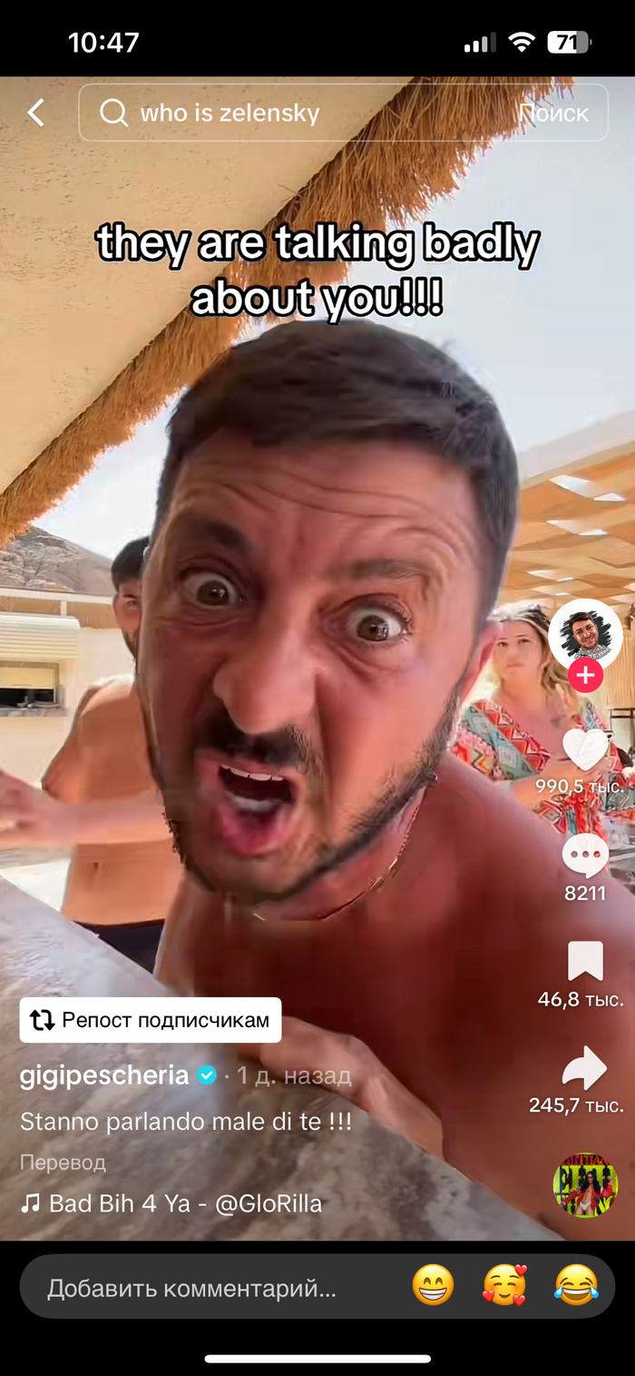 Наткнулся вчера на тик ток аккаунт, сначала я подумал, что это нейронка, но нет. Это тик токер из Италии, с большим количество подписчиков кстати, комментарии преимущественно русские и украинские.