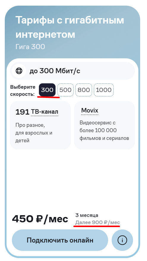 Я смотрел тарифы Домру, Ростелеком, МТС, сейчас у Ростелекома появились 500мбит за 1000р, что лучше, чем 300 за 900, но это совсем новый тариф.