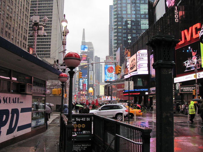 Я оказался на Таймс-сквер. Сквер, это так.. может он и был когда-то на этом месте, или , считая себя полиглотом так перевожу это слово, но деревьев там нет. Есть изобилие наружной рекламы.Много..много.. Грандиозные телеэкраны, фантастические краски, интересная архитетура небоскребов.. Это был эмоциональный удар. Первое впечатление - я не в Америке, я вообще не на этой планете. Вспомнились все американские футуристические фильмы. Шел дождь, я стоял в центре людского потока, капли воды стекали с козырька моей кепиздейки, но было наплевать. Появилось ощущение, что я нахожусь в столице мира, галактики, вселенной. Минутное восхищение, но именно в эту минуту я понял, что приехал сюда, что нахожусь здесь. Есть расхожее выражение про "увидеть Париж и умереть". Это не то, что хочешь видеть постоянно, но это то, что восхищает своей искусственной грандиозностью. Эмоциональный шок! Я уж себе под нос говорил, что фантик лучше конфеты, и цитировал Макаревича: мол"вчера я любил Калининский, а теперь выбираю Арбат"...