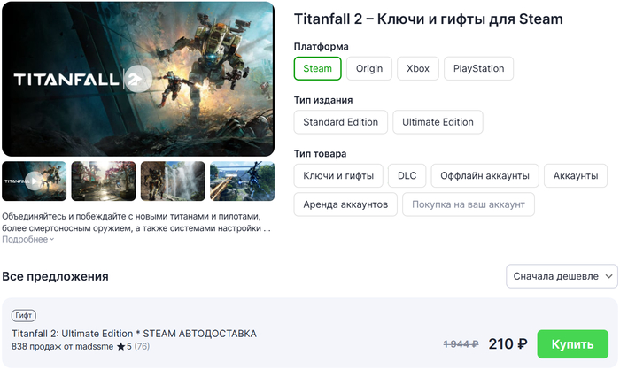 Переходим в категорию «Titanfall 2» и выбираем подходящий товар. Также, как и в предыдущем способе, смотрим на его критерии, внимательно читаем описание и оплачиваем.