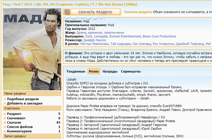Потихоньку продвигаю наш перевод / озвучку на Рутрекер и Кинозал, но пока выложено проектов 15 из 39. Занимаемся переводом и озвучкой фильмов, которые ранее не имели ок перевод и существовали только в одноголосках спорного качества. Так что беспокоюсь за такие уважаемые треккеры. Релизики -