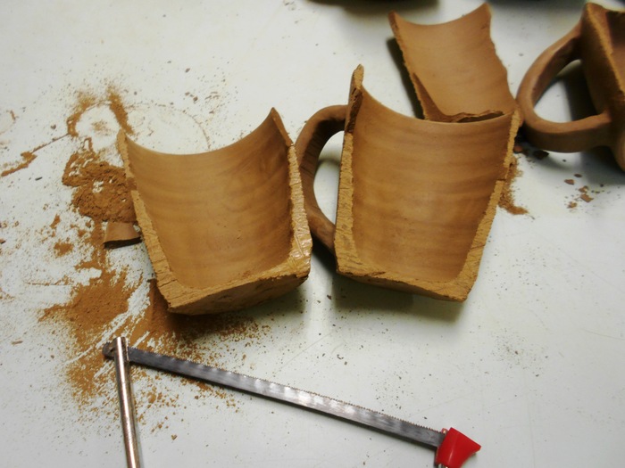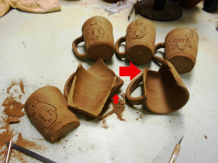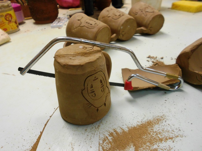 С добавлением песка дела пошли веселее, и треснула всего одна кружка с котиком, как выяснилось при вскрытии из за разности в толщине стенки/дна.