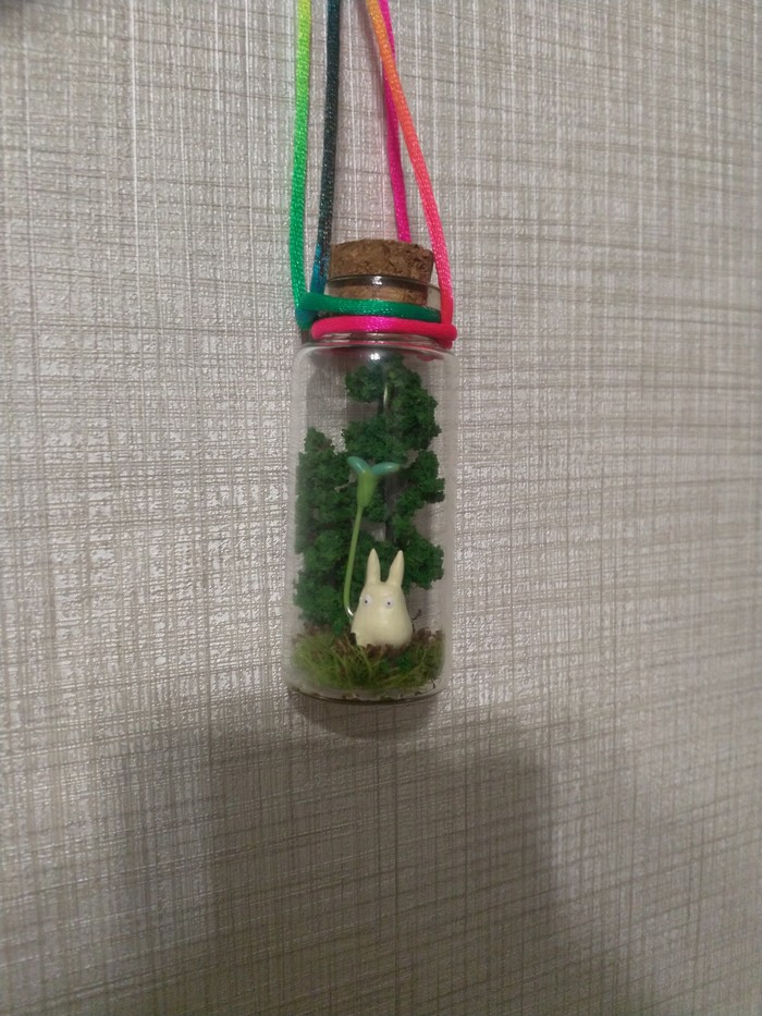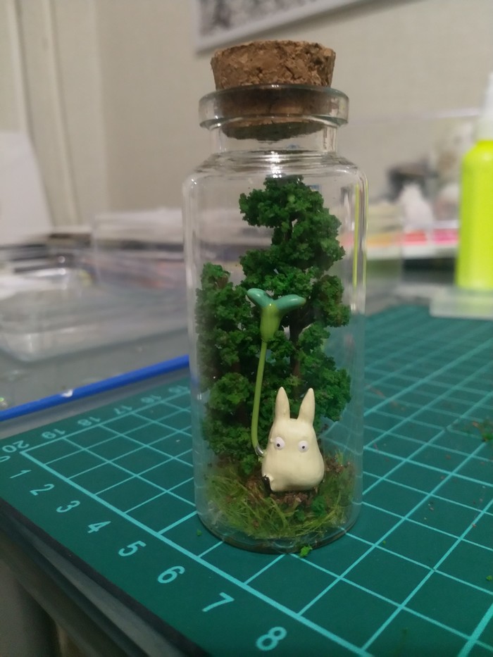 Далее так же на клей, сажаем наши деревья. И в последнюю очередь нашего друга из знаменитого мультика "Мой сосед Тоторо". Закрываем пробкой. Как использовать каждый придумает для себя сам.