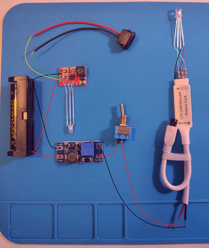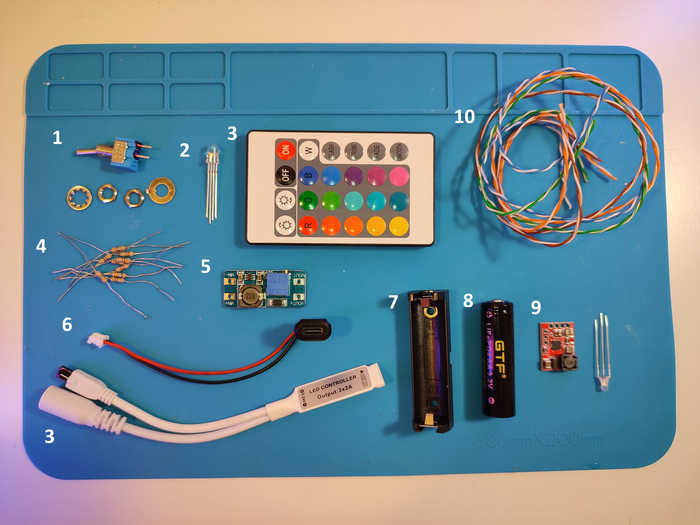 1 - тумблер в качестве выключателя для всей схемы; 2 - РГБ светодиод; 3 - РГБ-контроллер в комплекте с пультиком; 4 - резисторы для светодиода прядка 30 Ом; 5 - повышающий DC-DC преобразователь; 6 - разъём type-C; 7 - холдер для аккумулятора типоразмера 14500 (батарейка АА); 8 - аккумулятор LiFePO4; 9 - контроллер заряда tp5000 с светодиодом в комплекте; 10 - немного витой пары (люблю паять макеты на ней).