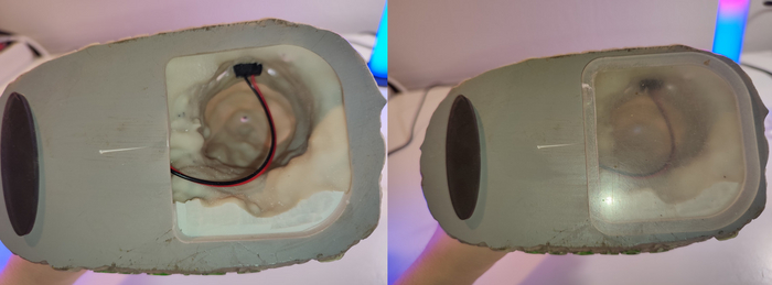 Мне повезло, что сам светильник был сделан из искусственного камня, легко поддающегося сверлению, и также был пустотелым внутри. Я отнесла его в мастерскую в своём городе и мне сделали там основное отверстие под всю электронику и крышку для него из оргстекла с ножкой на другой стороне, чтоб не шаталось, а также просверлили отверстия для разъёма type-c, светодиода контроллера зарядки и отверстие для проводов, которые пойдут к светодиоду. Отверстия под тумблер и инфракрасный датчик от РГБ контроллера я уже сверлила сама, так как забыла попросить об этом мастера :) Разъём мне вставили прямо в мастерской, туго шёл).