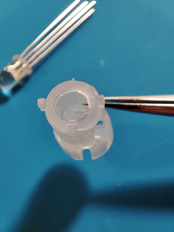 Выдираем это всё, также я вырезала нижнее отверстие под светодиод до круглого иначе оно не стыковалось с верхним. Я сделала его чуть меньше юбочки светодиода, чтоб он не гуглял туда сюда и зафиксировался, как было в изначальной конструкции.