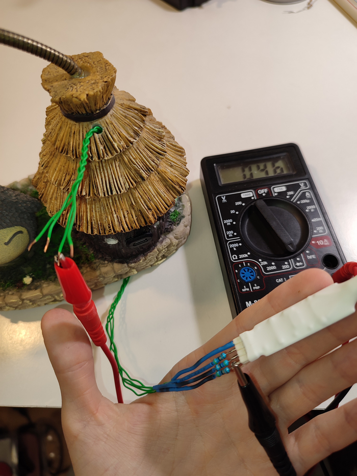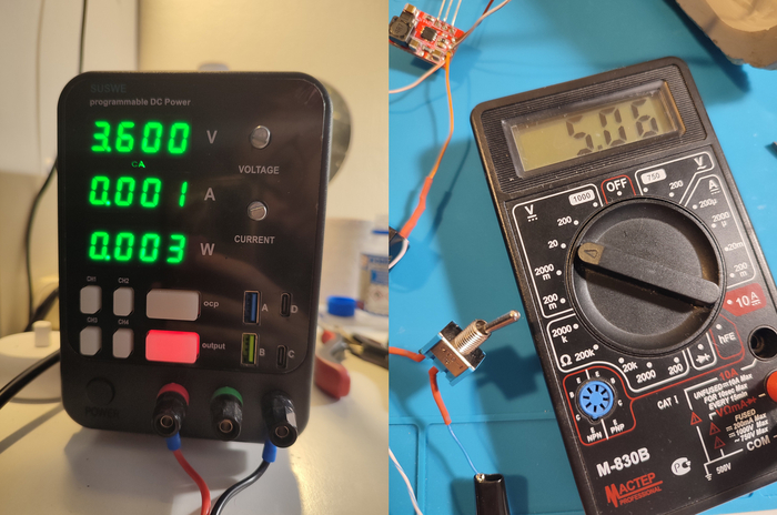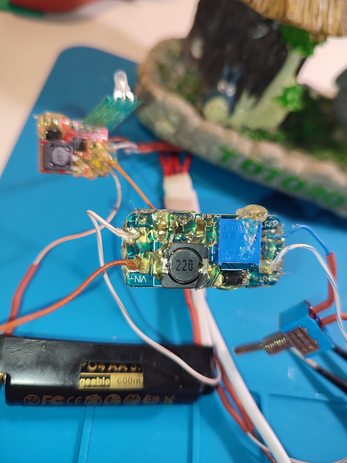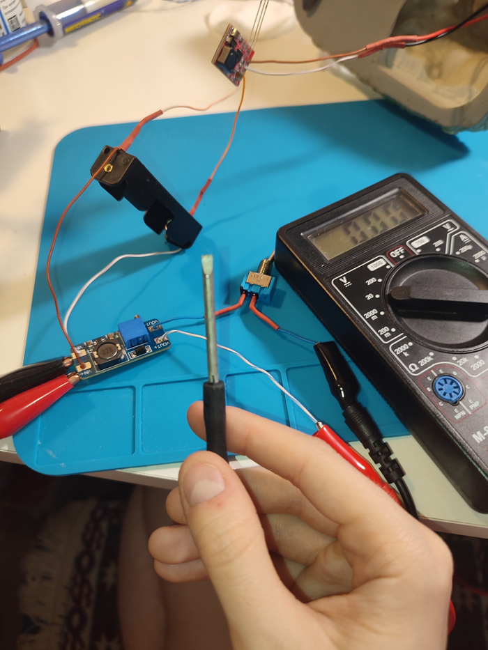 Когда уже всё припаяли вспомним, что нужно настроить повышайку. Она нужна нам, чтобы с напряжения 3.65 В с аккумулятора повысить до 5 В, это минимально требуемое питание для РГБ контроллера. Настраиваем её маленькой отвёрточкой, следя за напряжением на мультиметре, подцепленному ко выходу модуля, ко входу я подцепила БП, выставив на нём 3.65 В, имитируя аккумулятор.