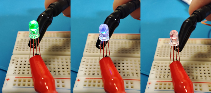 Чтобы быстро определить распиновку светодиода нужно включить на мультиметре режим прозвонки, плюсовым щупом зацепиться за самую длинную ногу, а минусовым тыкать в остальные и смотреть какой будет цвет.