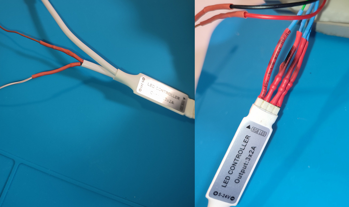 Схема подключения приведена выше, однако ваш контролер и светодиод могут отличаться от моих, в этом случае вы можете поискать даташиты или собрать пробную схему и методами тыка и исключения определить куда что подключать. Но обычно самая длинная нога светодиода это питание, её нужно подключать к разъёму контроллера, который на корпусе отмечен треугольничком, остальные ноги отвечают за каждый цвет, их нужно обязательно подключать через резисторы.
