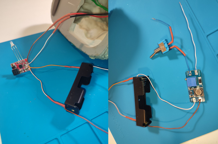 После тестов осталось припаять схему питания. От аккумулятора провода идут на tp5000 на разъёмы B+ и B-, а разъёмы IN+ и IN- подпаиваются к type-c разъёму. И также от аккумулятора провода идут на повышающий преобразователь. На плюсовой выход преобразователя в разрыв паяем тумблер, главное не забывать заранее надеть термоусадку :) Не знаю зачем я поставила тумблер именно туда, надо было садить его на плюс аккумулятора, будет повод навестить родителей и исправить сей косяк.