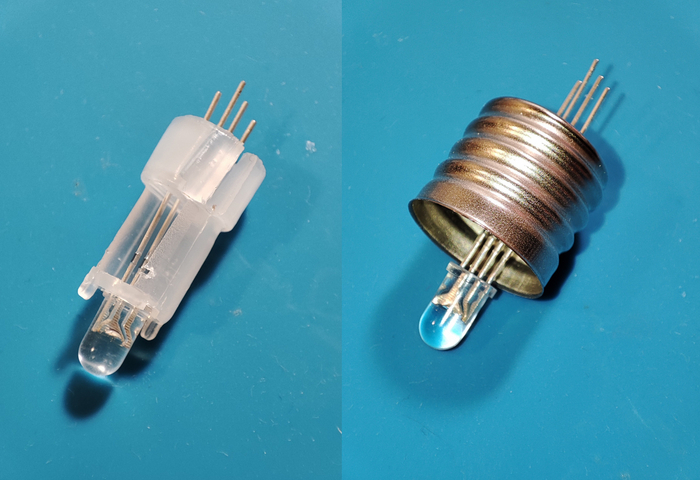 Чтобы в итоге внутри оно встало как на первом фото. Однако припаивала к проводам я всё без этой пластмассовой штуки для удобства, а потом с усилием надела её обратно и светодиод продолжил стоять в лампе зафиксированным. Во время пайки не забыла надеть колпачок от лампочки иначе потом его было бы никак не вернуть на место.
