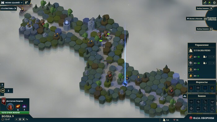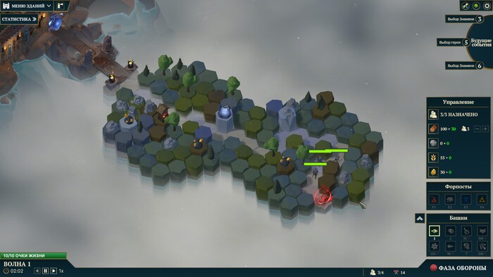 Очень хорошо устроены и сами локации, по которым нас атакуют враги. Гексы для расположения башен здесь очень неодинаковые. Каждая площадка имеет свою высоту (драматически влияет на радиус атаки) или может обладать особыми свойствами типа усиления видов урона или добавки стата.