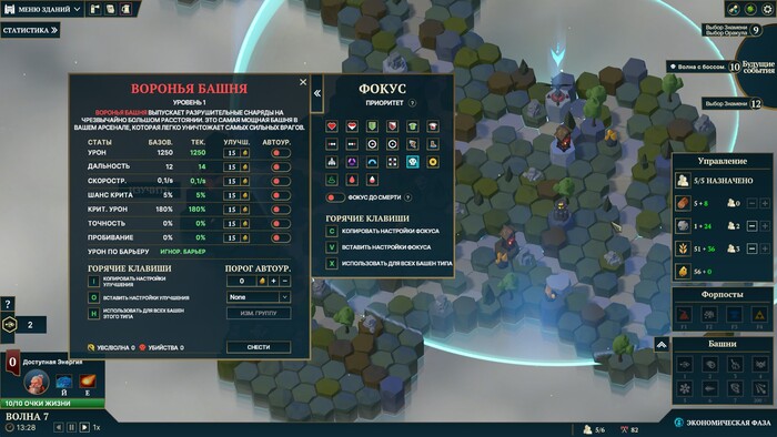 Статов у защитных сооружений очень много. Какой именно из них развивать зависит от многих факторов. Например, чутка не хватает радиуса атаки, чтоб захватывать большой участок пути врагов, тогда, логично, радиус качаем. Или на какой-то вид башен налутали урона, тогда есть смысл шанс крита повысить или ещё что придумать. И вот таких приколов много.