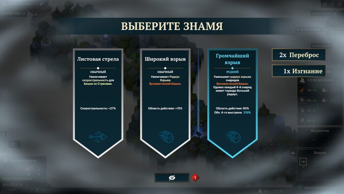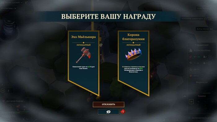 Почти каждый ход, кроме всего прочего, нам отсыпают какое-то улучшение (знамя) или находим какой-то лут. Всё это усиливает наше королевство или башни.