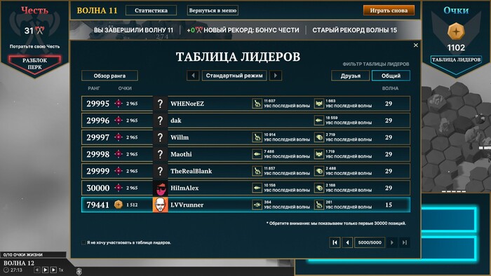 Чем больше ходов мы проживем, тем выше окажемся в списке лидеров. За новые рекорды будем получать бонус к заработанным очкам чести. Если новый рекорд не установлен, то бонуса не будет.