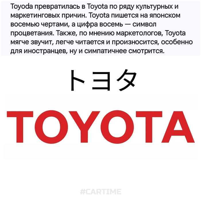 Важно также, что написание "Тойота" является для нас традиционным и устоявшимся именно касательно бренда, поэтому менять его не будут, даже несмотря на то, что оно не соответствует современным правилам русского языка. Кстати, первое упоминание этого слова я нашёл в словаре новых слов русского языка 1950–1980 годов, и там указаны оба варианта.