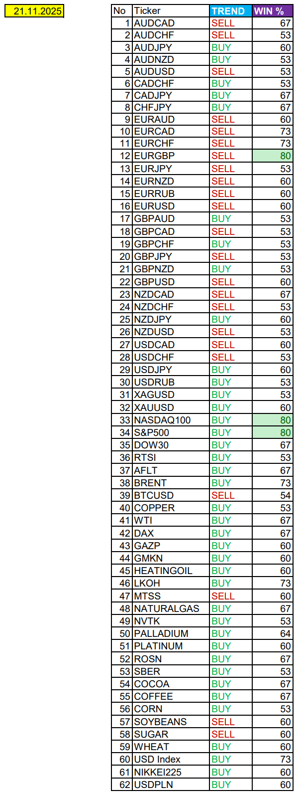 Очередные сезонные тенденции на пятницу 21 ноября 2025 по основным мажорам финансовых рынков.