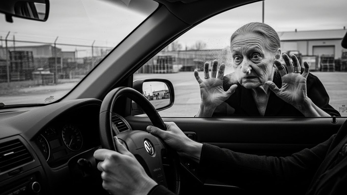 А потом в моё окно вдруг врезался оглушительный, молотящий удар. Я дёрнулся и повернулся — и увидел старуху с тонкими седыми волосами в чёрном платье. Она снова и снова лупила старческой ладонью по водительскому стеклу. В глазах у неё было такое выражение, будто она хотела меня поджечь.