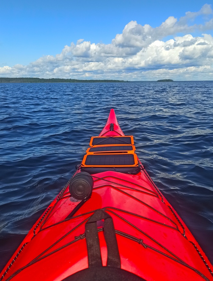 Сегодня проёбываюсь со стартом, как бы я не заставлял себя собираться быстрее выхожу на воду только к 10 утра. Повербанк на 20 тыс. mAh почти разряжен, подключаю к нему солнечную панель, и закрепляю её на носу каяка, позже из-за волн, переношу на корму.