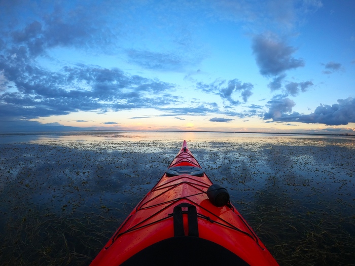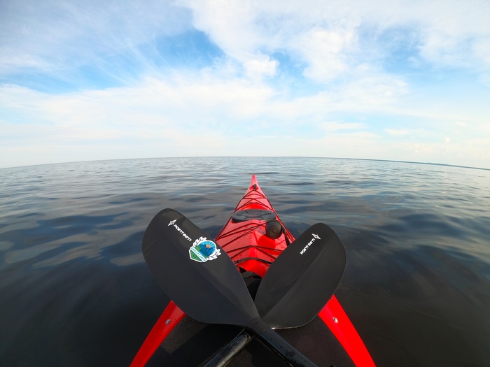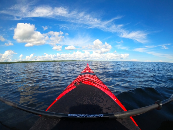 Прохожу по острову, источников воды тут нет, зато есть земляника. Оставаться здесь до завтра без воды я не хочу, но плыть до западного берега мне ещё около двадцати километров. Решаю рискнуть, сажусь в каяк, огибаю остров и плыву в горизонт, противоположного берега не видно.