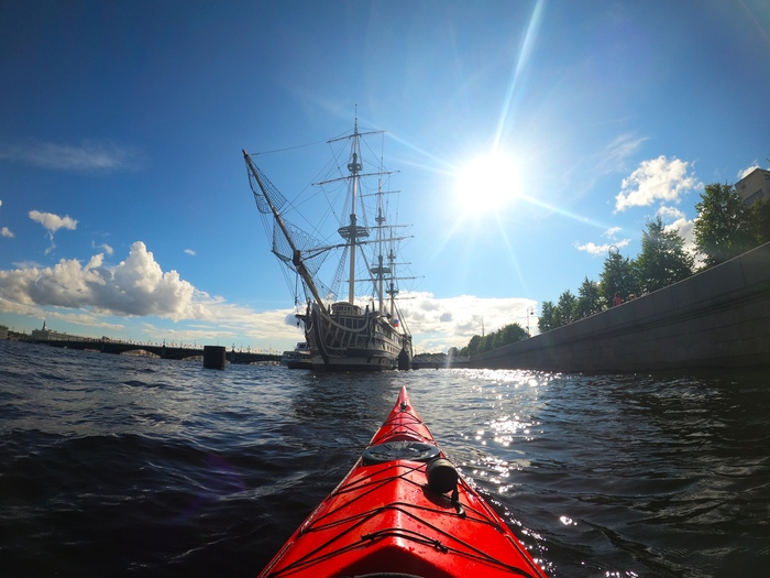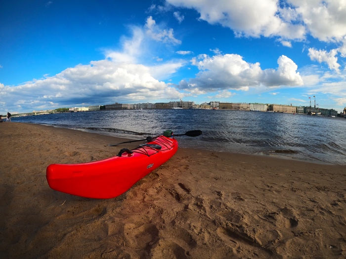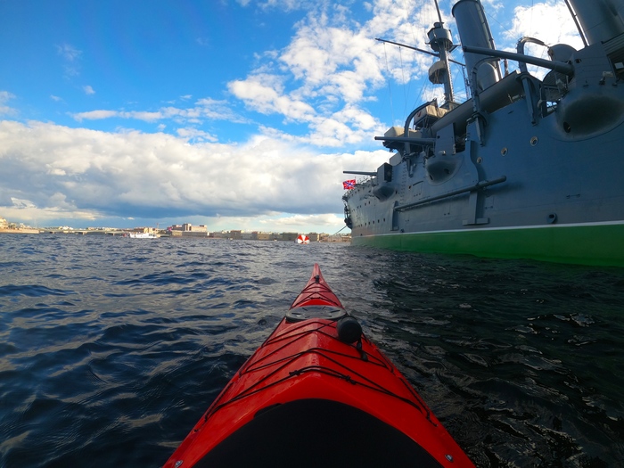 Через девять часов, почти непрерывной гребли, добираюсь до окраин СПБ, тут меня встречает ливень, погода сильно переменчивая, то светит солнышко, то всё небо заволакивает облаками и поднимается ветер. В городе, волны бьются о набережную, превращаясь в треугольные и раскачивая каяк во все стороны, скрадывая мою скорость. Рядом проходящие суда создают волны с которыми приходится считаться. Остаётся совсем немного, ещё один поворот и я уже вижу в далеке шпили на крыше крепости. Прохожу в нескольких метрах от крейсера Аврора, прохожу под Троицким мостом, и вот она, Петропавловская крепость, выхожу на берег, уставший но счастливый. Это были долгие 13 дней путешествия, я сделал это!!