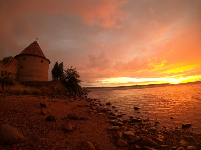 Ближе к вечеру замечаю что водоросли в воде всё чаще устремлены в одну сторону, по направлению моего пути, чуть позже ощущаю подросшую скорость моего движения, тут начинается течение. Завтра мне предстоит пройти по течению Невы и спуститься к Питеру, около 70 километров, предвкушаю лёгкую прогулку, на этом отрезке финишной прямой течение должно само меня нести. А пока, становлюсь на ночлег на острове Ореховый, прямо под стенами крепости Орешек.